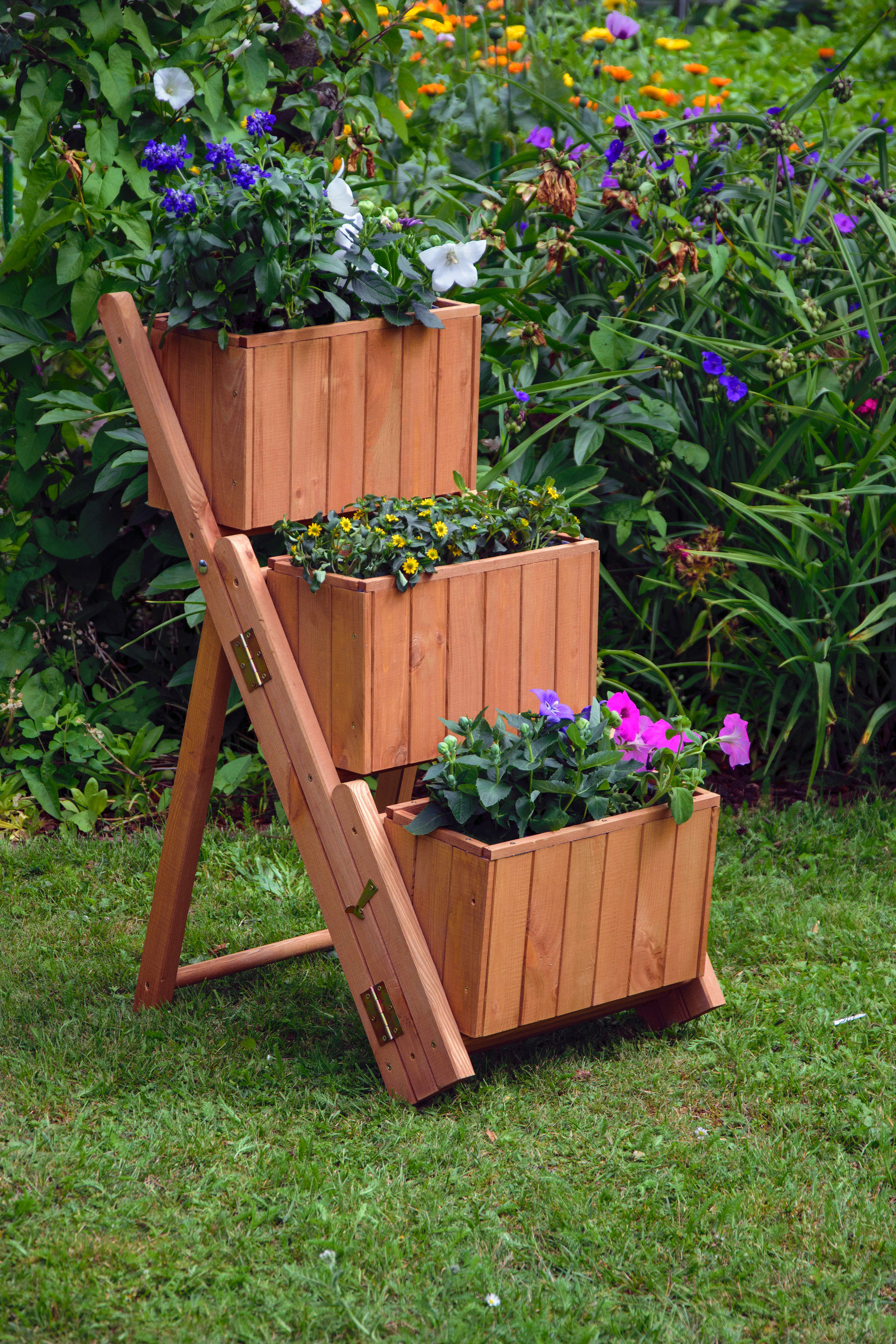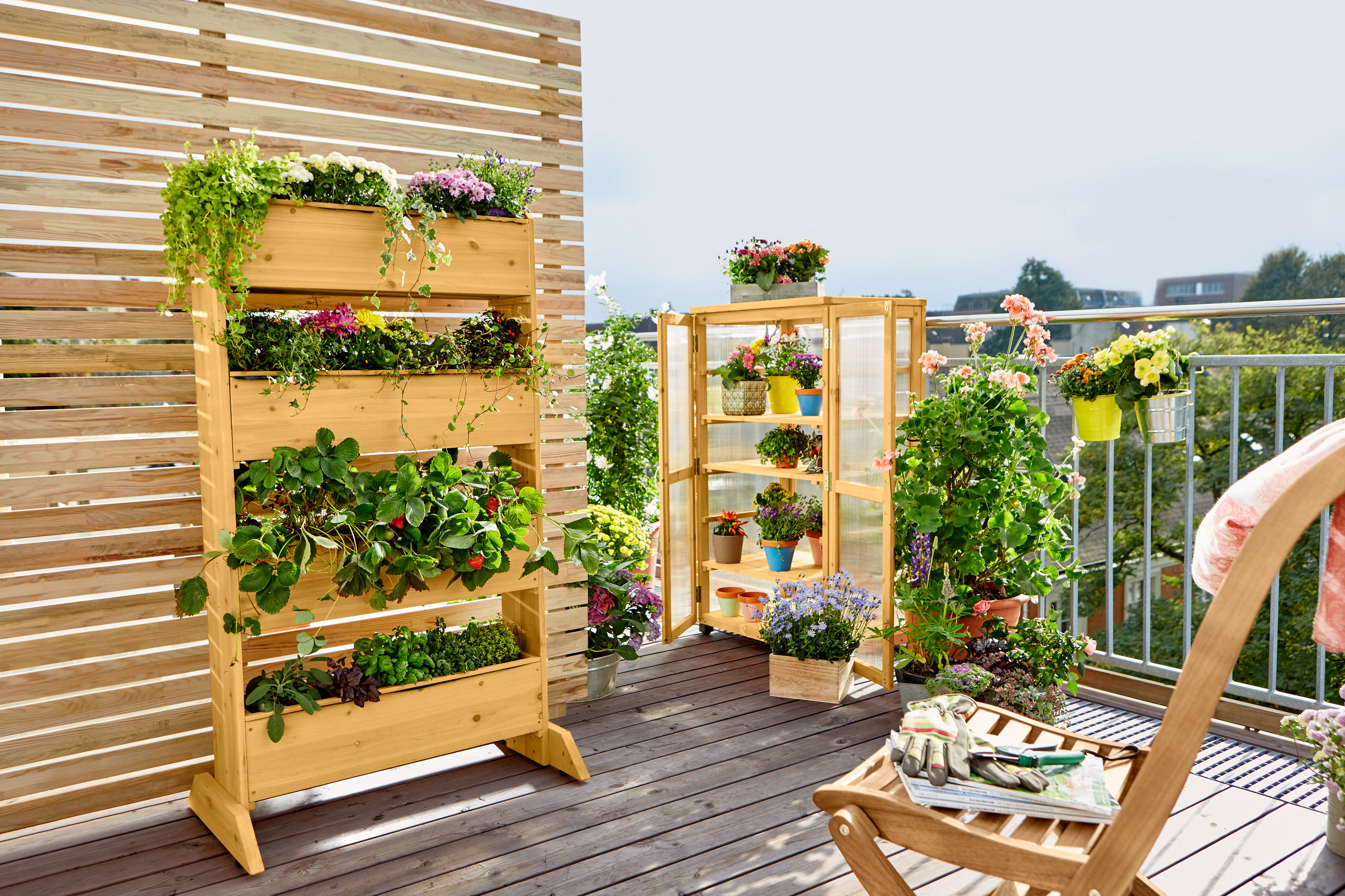 Postarajte sa na jar o kvetinovú nádheru ako vo sne tým, že rôzne rastliny umiestnite do viacerých úrovní: Skombinujte napríklad natesno rastúce popínavé rastliny vo veľkých kvetináčoch na zemi s rôznymi pestrými kvetmi v závesných kvetináčoch alebo v moderných pestovateľských vreciach. Alebo využite kvetinové schody, na ktoré naaranžujete rôzne rastlinky. Tak vznikne obzvlášť bujná, svieža mini záhradka. S pomocou praktických vyvýšených záhonov a malých skleníkov si okrem toho môžete vychutnávať aromatické bylinky a bobuľovité ovocie, ktoré si sami dopestujete.