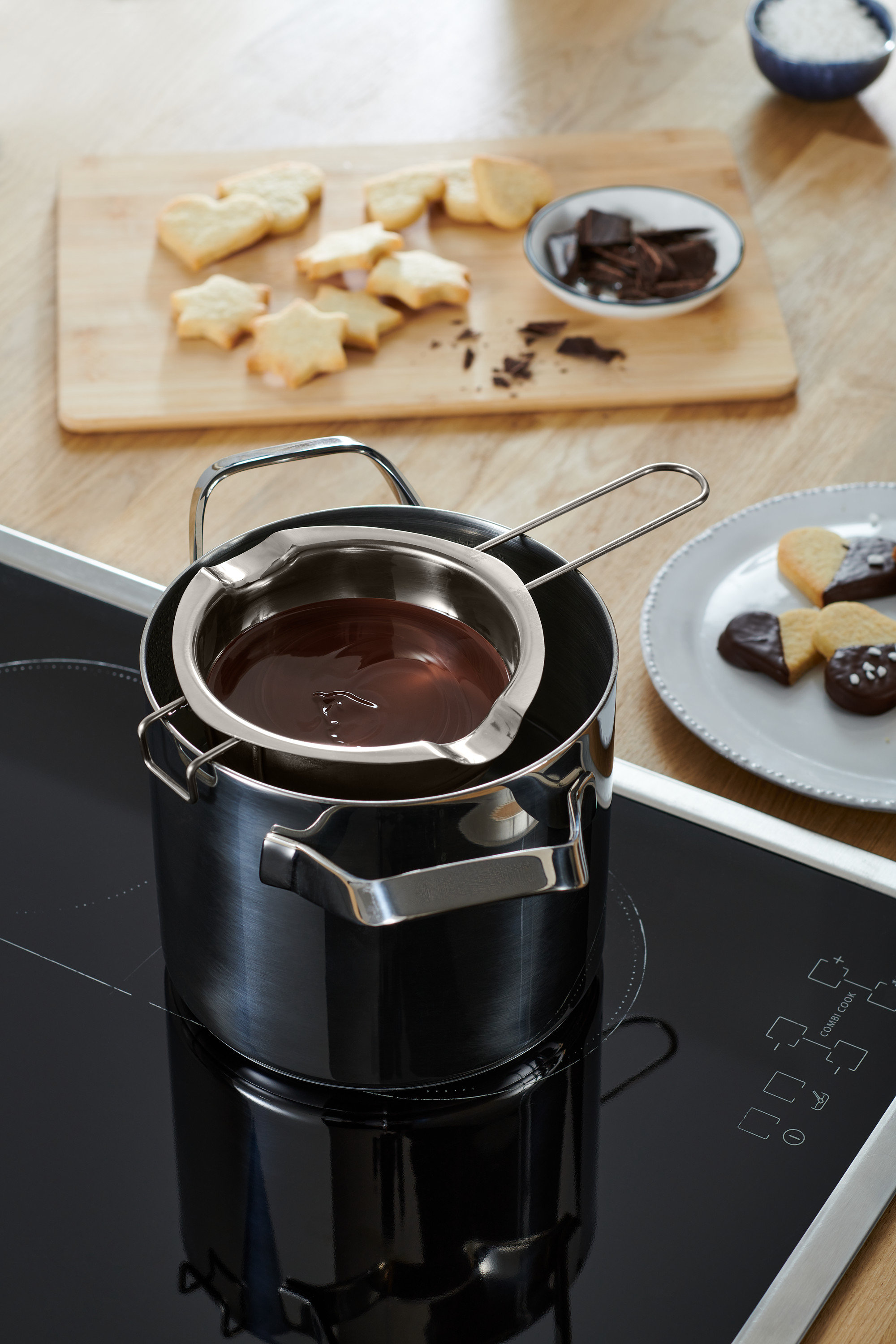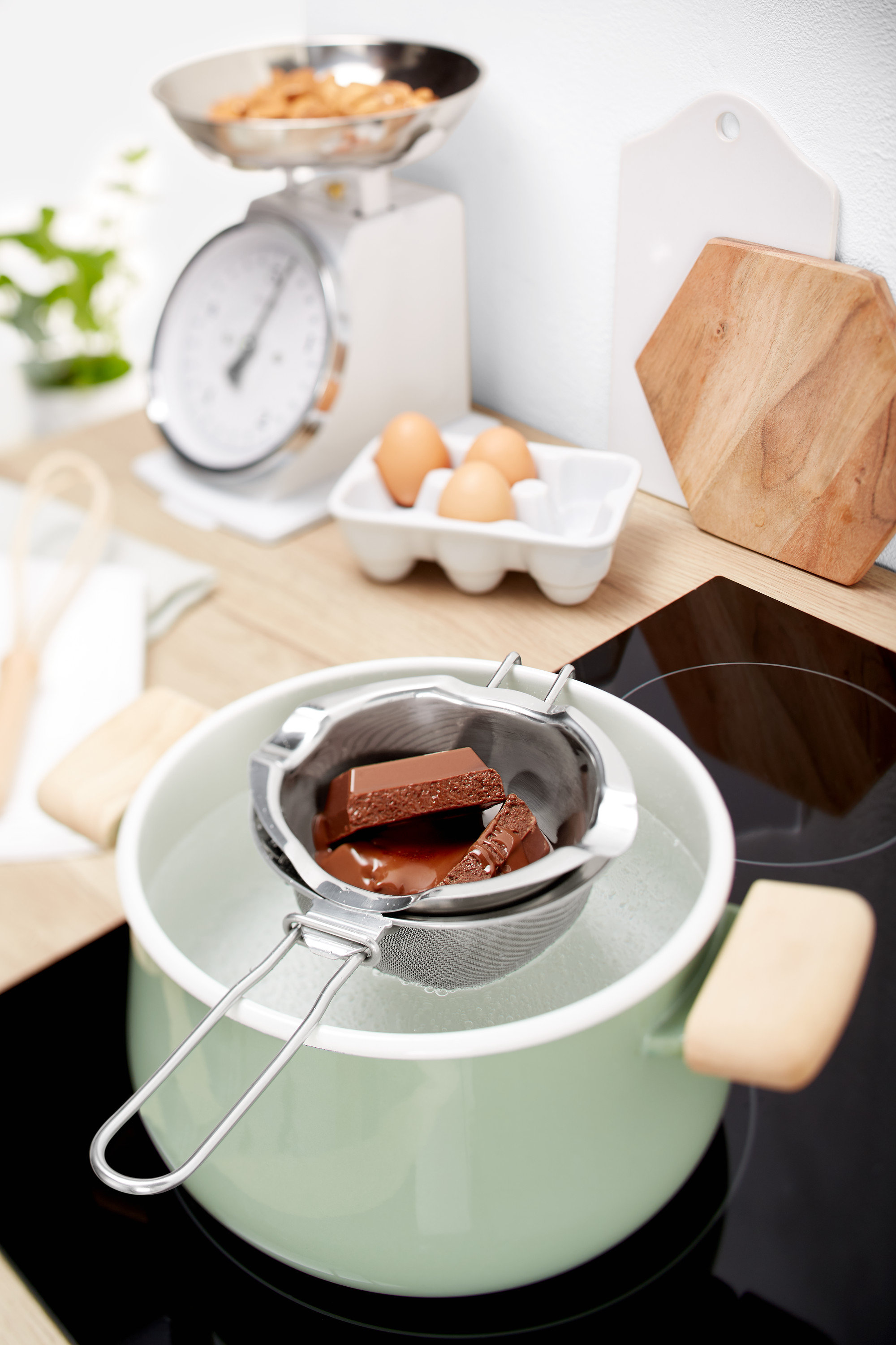 Miska na šľahanieMiska na šľahanie – najlepšie z antikora – sa dá vďaka jej zaokrúhlenému dnu perfektne a bez skĺznutia položiť na hrniec. Preto sa výborne hodí na vodné kúpele, či už studené alebo horúce. Profíci radi používajú aj drahší variant z medi. Medený riad dobre vodí teplo a môžete ho nájsť v každom dobrom cukrárstve.