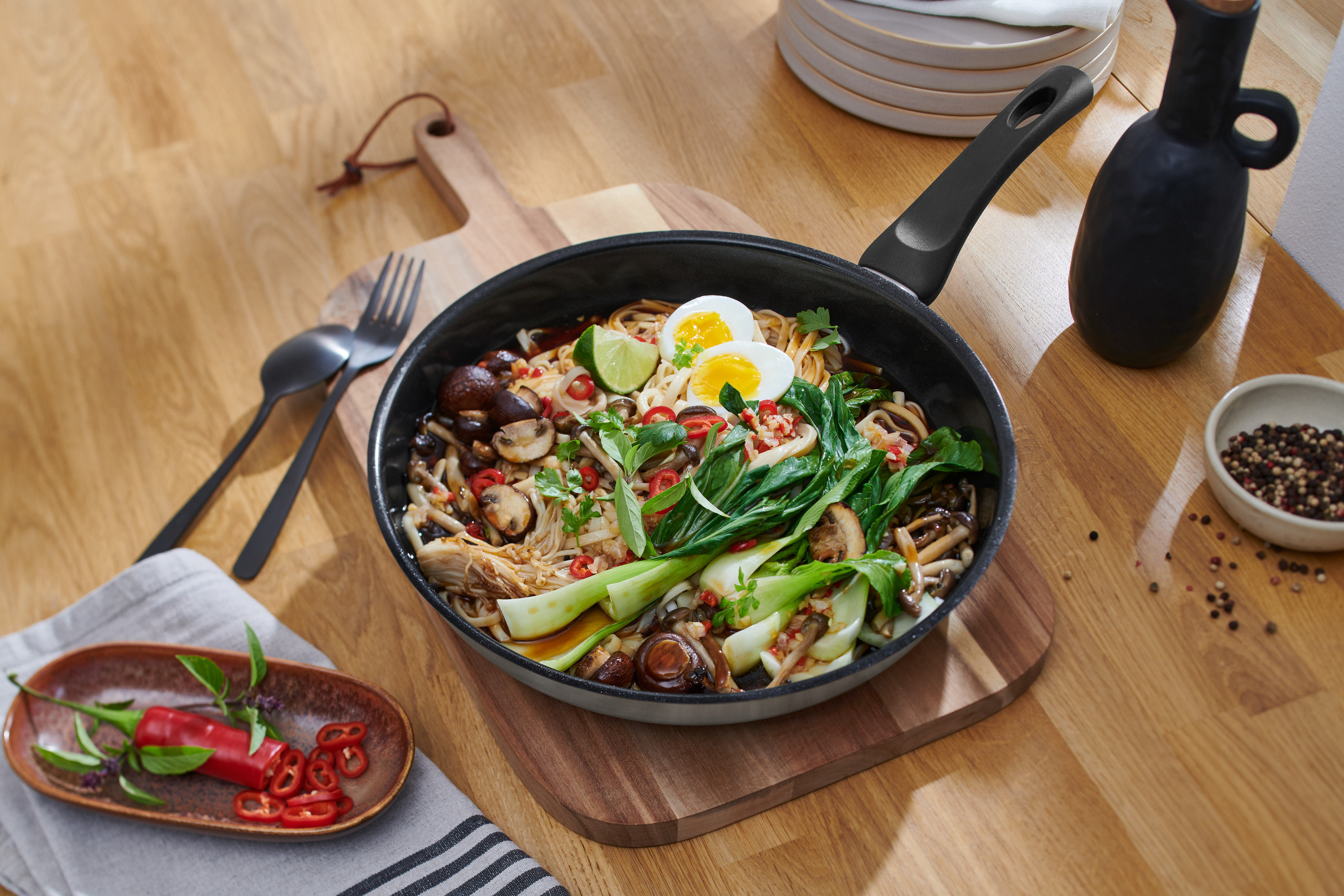 Medzitým zohrejeme olej vo woku na cestoviny. Zrniečka, jarnú cibuľku a cesnak v ňom za stáleho miešania opekáme asi 1 minútu. Cestoviny, olivy a paradajky primiešame. Všetko dusíme na miernom ohni asi 2 minúty. Cestoviny naservírujeme s paprikovou omáčkou a podávame s hoblinkami syra.