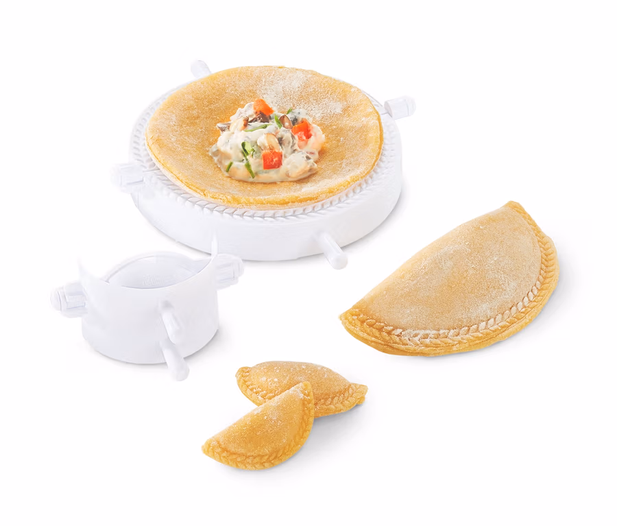 Kúpiť cestoviny dokáže každý. Ale s touto súpravou formičiek na plnené taštičky si ich môžete úplne jednoducho vlastnoručne vyrobiť. Tieto dve formičky na plnené taštičky totiž v kuchyni otvárajú úplne nové možnosti na prípravu špecialít z cesta na cestoviny, lístkového alebo štrúdľového cesta. Praktické kuchynské pomôcky z kvalitného plastu uzatvoria plnené taštičky tak, že na okraji sú ozdobené vzorom olivovej ratolesti. Z cesta stačí vykrojiť tvar, ktorý máte najradšej. O ešte väčšiu stredomorskú rozmanitosť na stole sa postarajú priložené recepty.