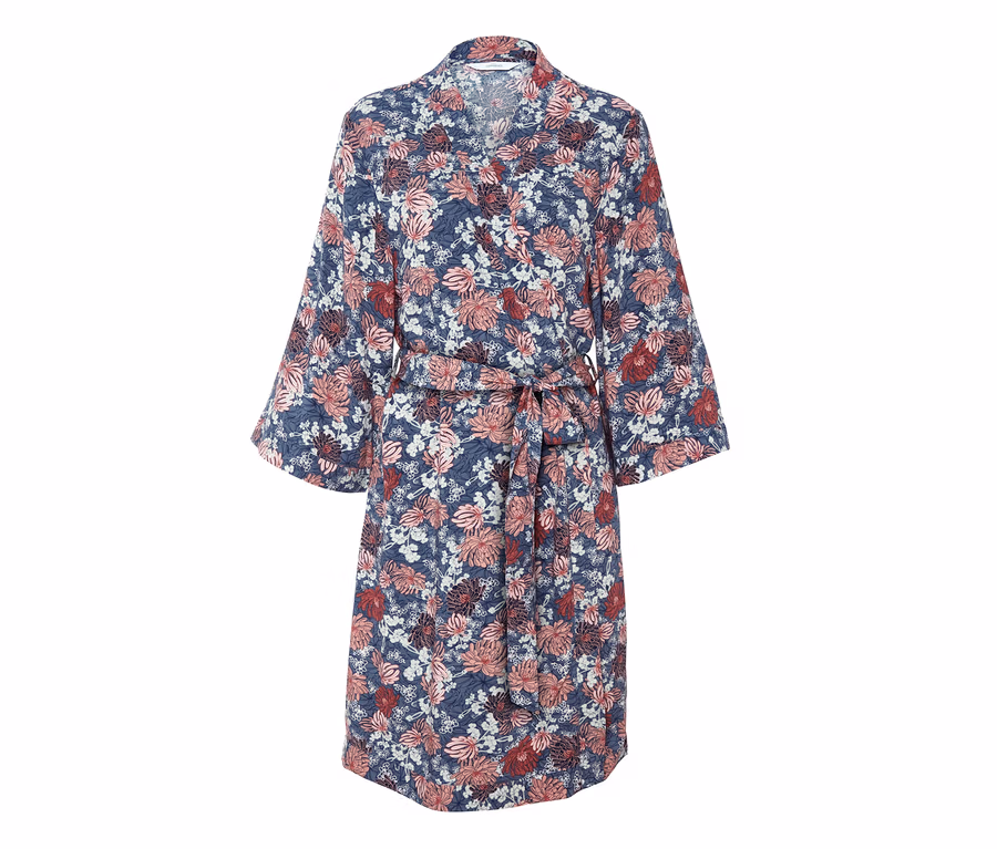Tento župan v klasickom kimonovom štýle sa ideálne hodí na to, aby ste začali uvoľnený deň s dobrým pocitom na pokožke. Je vyrobený z tkanej viskózy, ktorá príjemne mäkko splýva okolo tela. Okrem klasického opaska na zaväzovanie má župan vnútornú šnúrku na zaväzovanie na úpravu šírky a kvetinová potlač vyčaruje krásny akcent s romantickým nádychom.