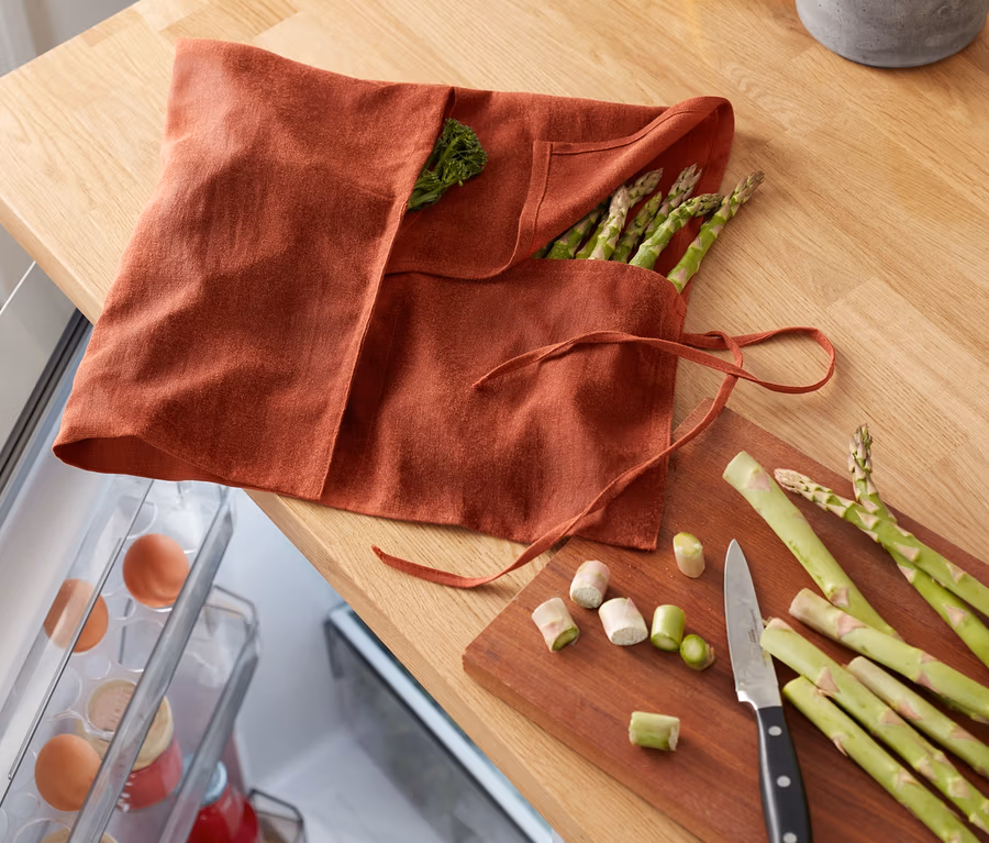 - Utierku zľahka navlhčite a vrecká naplňte zeleninou a bylinkami, horný okraj preložte, zrolujte, zaviažte a uschovajte v chladničke