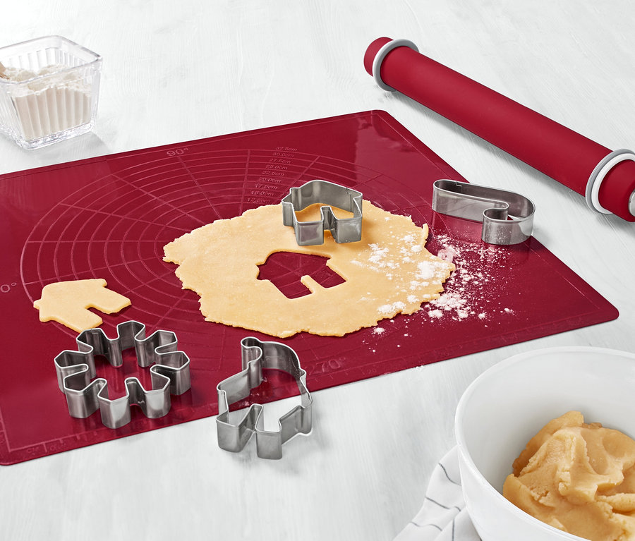 Podložka na pečenie zo silikónu sa prispôsobí všetkým požiadavkám: Dá sa zastrihnúť podľa potreby, a preto sa ideálne hodí na vyloženie tortových foriem. Vďaka protišmykovej spodnej strane a vrchnej strane s nepriľnavou povrchovou úpravou je podložka na pečenie ozajstný multitalent. Vidno to najmä pri vyvaľkaní cesta, pretože ju netreba poprašovať múkou ani vymastiť a pracovná plocha zostane pekne čistá. Podložka na pečenie ukazuje svoju veľkosť aj po pečení – má stupnicu v cm, vyrazený Ø a tortový rez.
