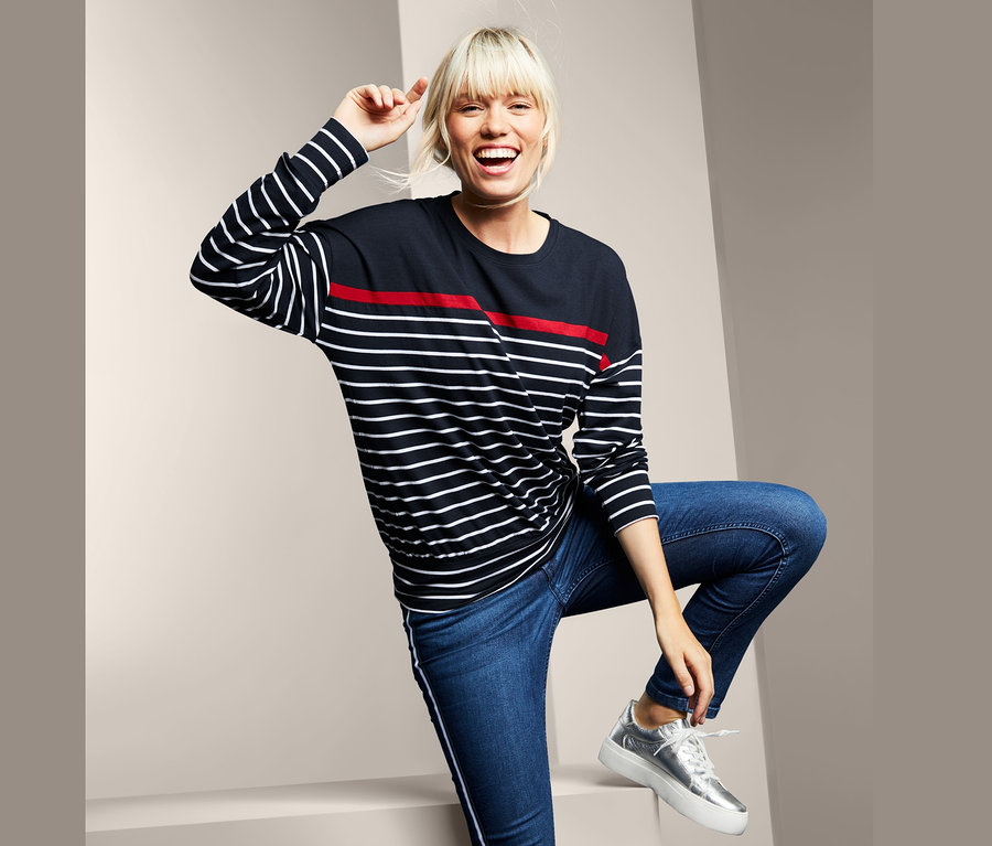 Toto tričko prinesie čerstvý vietor do Vášho šatníka. Vďaka jeho spadnutým ramenám, lodičkovému výstrihu a tiež netopierím rukávom je obzvlášť ležérne, zatiaľ čo sa široké lemy na spodnom okraji a rukávoch postarajú o to, aby tričko pohodlne sedelo. Tento dámsky vrchný diel má v oblasti pŕs vodorovný deliaci šev. Kontrastné prúžky a kovová ozdba na šiji pôsobia ozdobne.