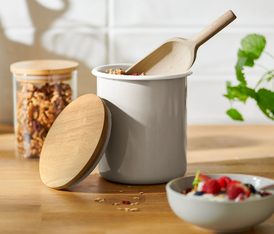 - Drevené veko udržiava suché potraviny dlhšie čerstvé.