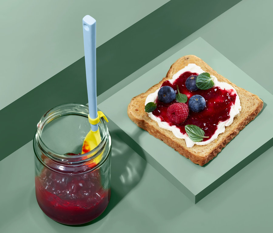 - So špeciálne tvarovanou pracovnou časťou z elastického silikónu na vyprázdňovanie pohárov od marmelády bezo zvyškov