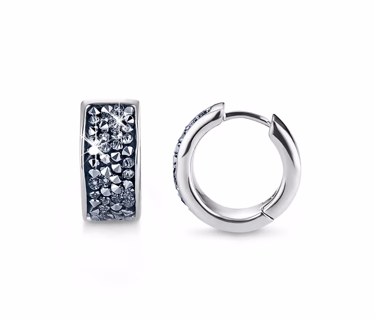 Meno Swarovski® je synonymom pre trblietavé detaily a nádych veľkoleposti! A preto tieto náušnice kreoly opulentne rozžiari veľké množstvo malých kamienkov Ultra Fine Rocks od Swarovski® a krištáľov Swarovski®. Lesk kamienkov je ešte umocnený tým, že tmavá plocha, na ktorú sú osadené, tvorí efektný kontrast k čírej farbe kamienkov.