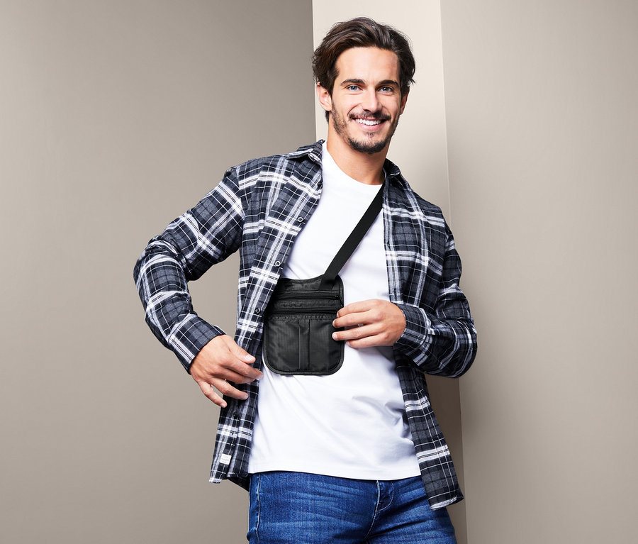 Kto má na cestách rád všetko dôležité hneď poruke, mal by sa postarať aj o bezpečné uschovanie týchto vecí – a táto bezpečnostná taštička je na to ako stvorená. Má ramenný popruh s nastaviteľnou dĺžkou a vďaka plochému a priliehavému dizajnu sa dá nenápadne nosiť aj pod oblečením.