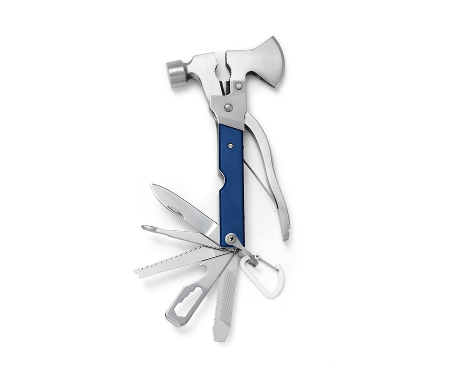 - 11 funkcií: sekerka, kladivko, nôž s hladkým ostrím, kliešte, pilník, pílka na drevo, pílka, krížový skrutkovač, plochý skrutkovač, skrutkový kľúč – 6, 7, 8, 10 mm a otvárač na fľaše