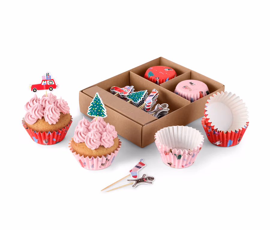 - Súprava sa skladá zo 48 častí: 24 formičiek na muffiny v 2 rôznych farbách a 24 zapichovacích ozdôb so 4 rôznymi vianočnými motívmi