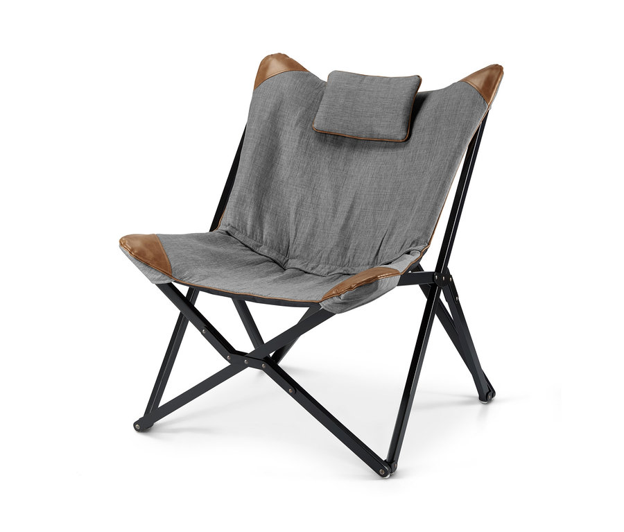Toto sklápacie kreslo má všetky predpoklady na to, aby sa stalo najobľúbenejším miestom medzi vlastnými štyrmi stenami. Je vyslovene štýlové, pohodlné a možno ho obratom ruky zložiť. Sedací nábytok má masívny skelet z bukového dreva s kovovými pántmi, ktorý je celý nalakovaný na čierno a unesie hmotnosť až 100 kg. Svojou sedacou plochou z kvalitnej štruktúrovej látky vyzýva kreslo na relax. Na rohoch je ozdobené aplikáciami z umelej kože a na operadle spočíva mäkký vankúš. Je fixovaný suchým zipsom a vydrží – rovnako ako poťah sedacej plochy – veľmi dlho.