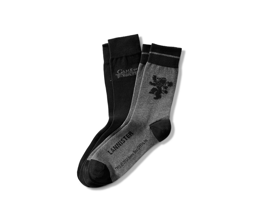 »Winter is coming« ... ale tieto ponožky môžu fanúšikovia Game of Thrones nosiť po celý rok. Obidva páry s vpleteným dielom s motívom Game of Thrones sú vyrobené z príjemne mäkkej bavlnenej zmesi a vďaka elastanu dobre držia tvar, perfektne sedia a výborne sa nosia. Ponožky majú zosilnené špičky a päty, sú vybavené obzvlášť plochými švami v oblasti prstov a ich elastické lemy sa nezošmykujú.
