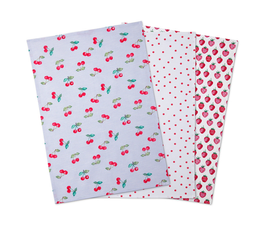 Na osušenie, zakrytie a zabalenie – utierky na riad sú absolútne nenahraditeľné v každej kuchyni. Tieto tri sú vyrobené z kvalitnej čistej bavlny, a preto výborne sajú a nepúšťajú vlákna. Vďaka ozdobným motívom ovocia utierky vyčarujú pestrofarebné akcenty. Pútka na zavesenie uľahčujú uschovanie utierok.