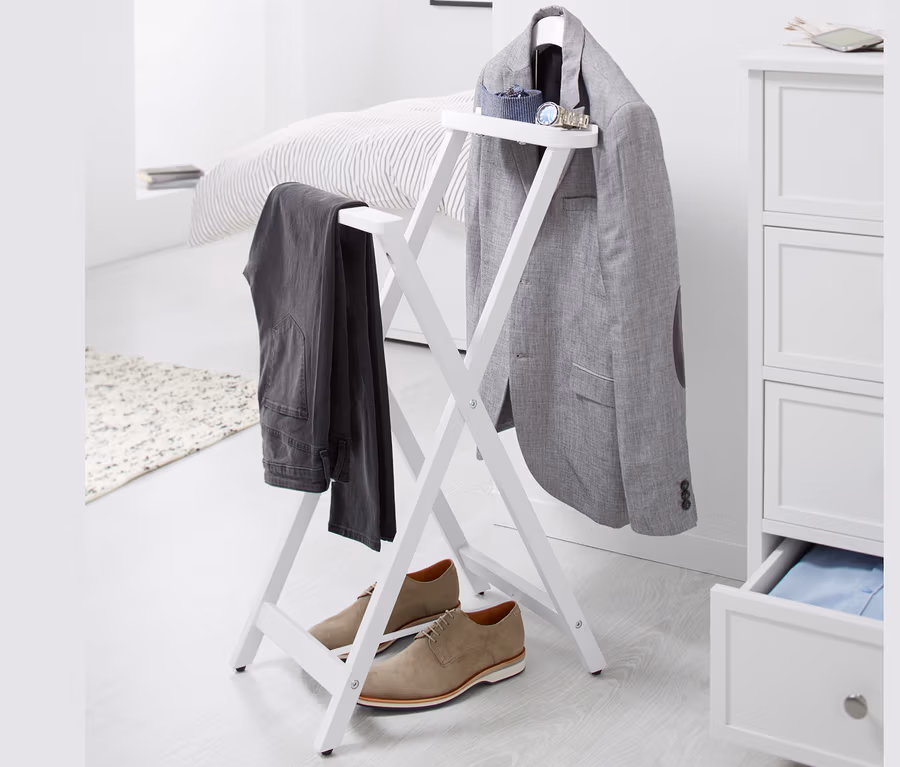 S vešiakom na šaty, vešiakom na nohavice a typickou odkladacou plochou na šperky a iné doplnky poskytuje veľa miesta. Konštrukcia je vyrobená z eukalyptového dreva s certifikátom FSC® a má textilnú pásku na vymedzenie roztvorenia sluhu. Keď nábytok práve nepotrebujete, dá sa priestorovo úsporne zložiť a uschovať – ale na to je vlastne priveľmi užitočný.
