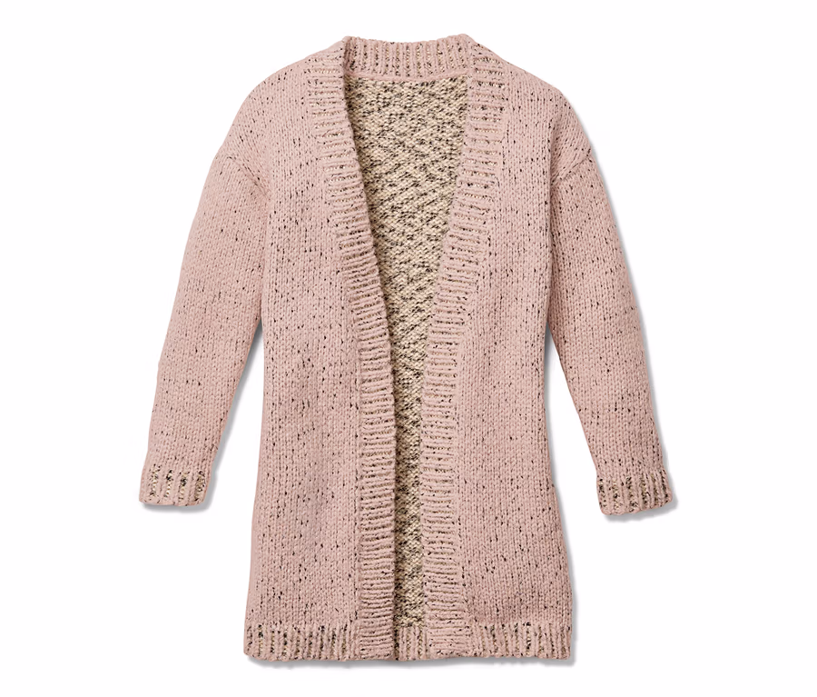 - Predĺžený strih s lemami z rebrovanej pleteniny na golieri, rukávoch a spodnom okraji