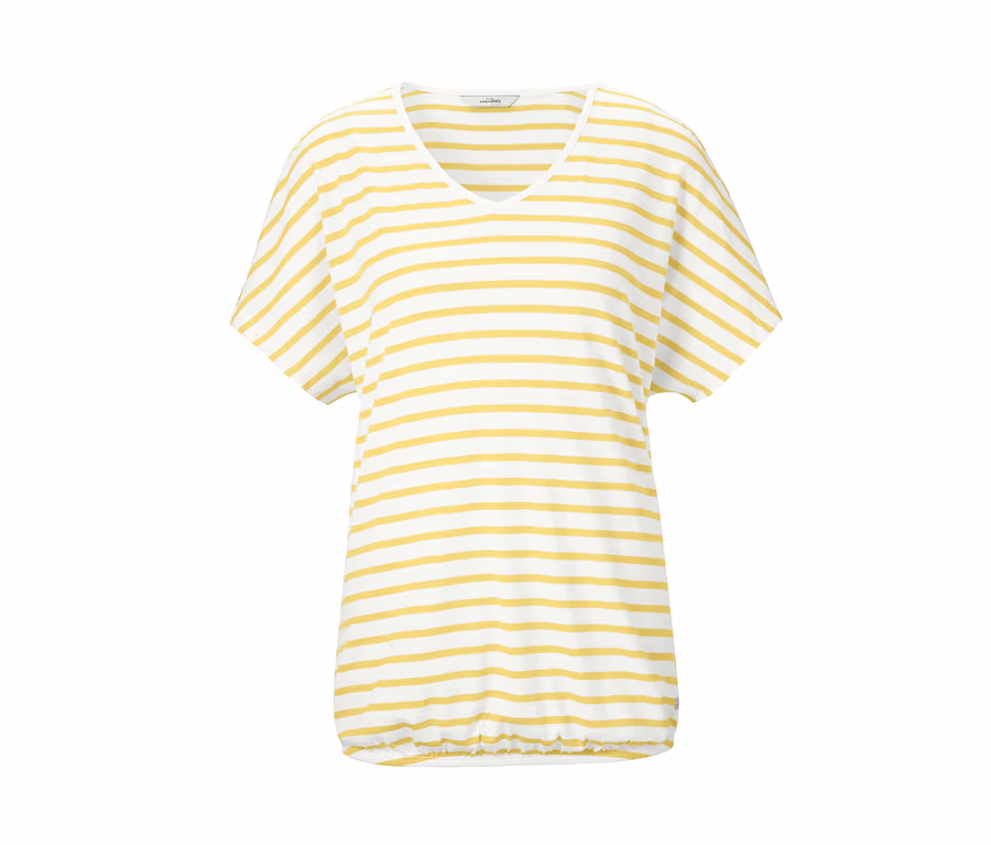 Toto prúžkované blúzkové tričko so vzdušným a ľahkým strihom je ako stvorené na leto. Vďaka mäkko splývavej zmesi bavlny a viskózy je výnimočne príjemné na nosenie a spadnuté ramená zaisťujú, že je mimoriadne ležérne na telo. Elastický spodný okraj sa postará o to, že tričko optimálne sedí, výstrih do V podčiarkuje líniu ramien a ozdobným detailom je kovový prvok na spodnom okraji trička.