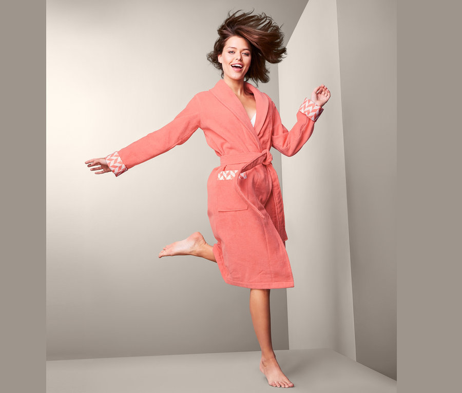 Župan vo vínovej farbe skvele vynikne aj z módneho hľadiska: má napríklad krásne lemovky na vreckách a koncoch rukávov. A okrem dvoch vreciek sú to aj ďalšie detaily ako šálový golier a opasok na zaväzovanie, ktoré sa postarajú o to, že kúpací plášť s dĺžkou po lýtka je výnimočne praktický. Mimochodom, praktické je aj pútko na zavesenie, pomocou ktorého sa dá uschovať na dosah ruky v kúpeľni.