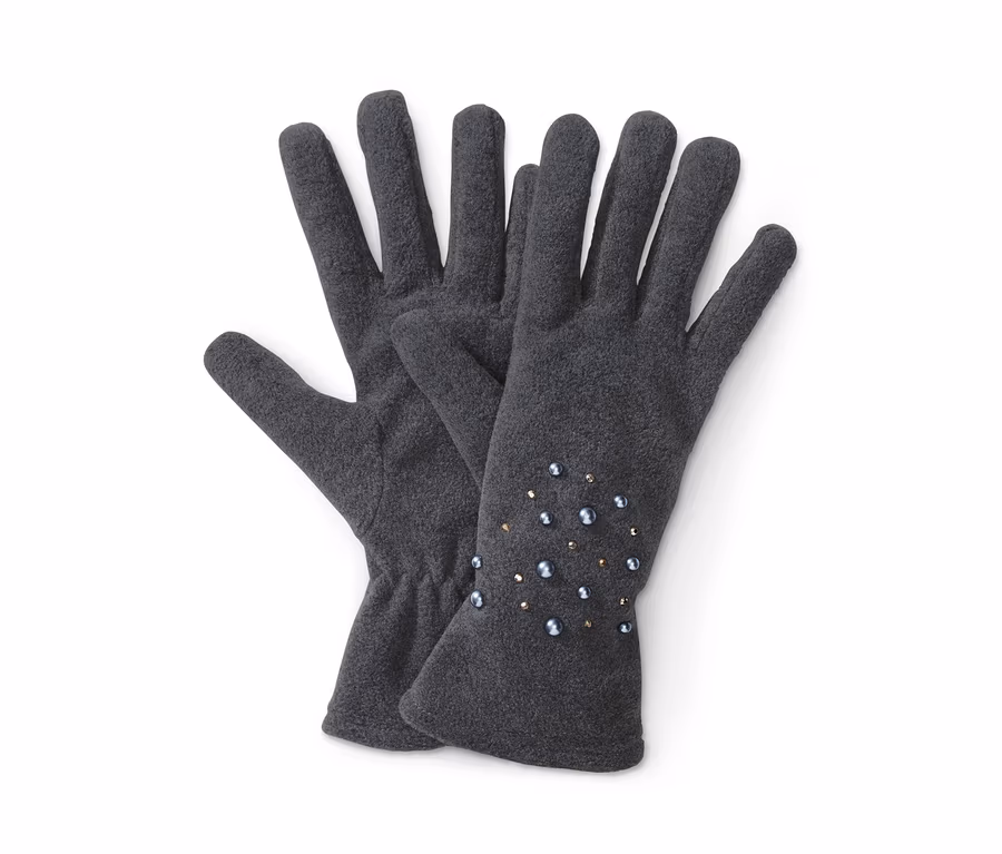 Pocit mäkkosti až po končeky prstov! Tieto dámske rukavice sú absolútne nenahraditeľným doplnkom na chladné dni: Keďže sú z príjemne mäkkého flísu, sú nádherne hrejivé. Okrem toho perfektne sedia vďaka sťahovaniu na gumu a nariaseniu na zápästí. A to najlepšie: Krásnym detailom sú ozdobné perličky a ozdobné kamienky, vďaka ktorým rukavice upútajú pozornosť.