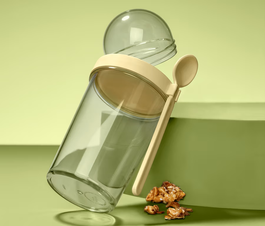 - Uzáver s ochranou proti vytekaniu, ideálny napríklad na prenášanie jogurtu – veko na oddelené uschovanie müsli alebo ovocia