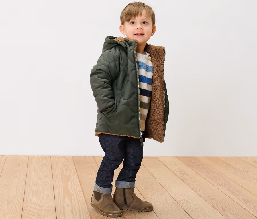 - 1 bunda – 2 vzhľady a 2 materiály: 1 strana prešívaná bunda, 1 strana plyšová bunda