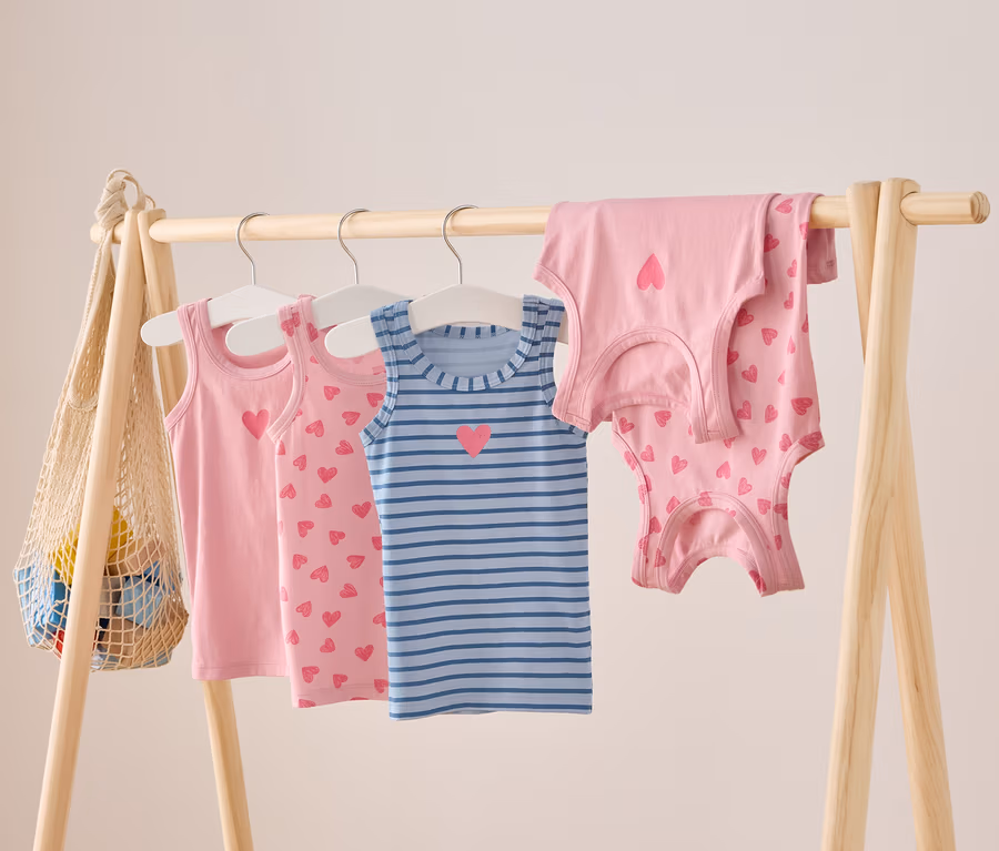 - 2x svetloružové s ružovými srdiečkami, 2x svetloružové s ružovou potlačou, 1x svetlomodro-tmavomodré prúžkované s ružovou potlačou
