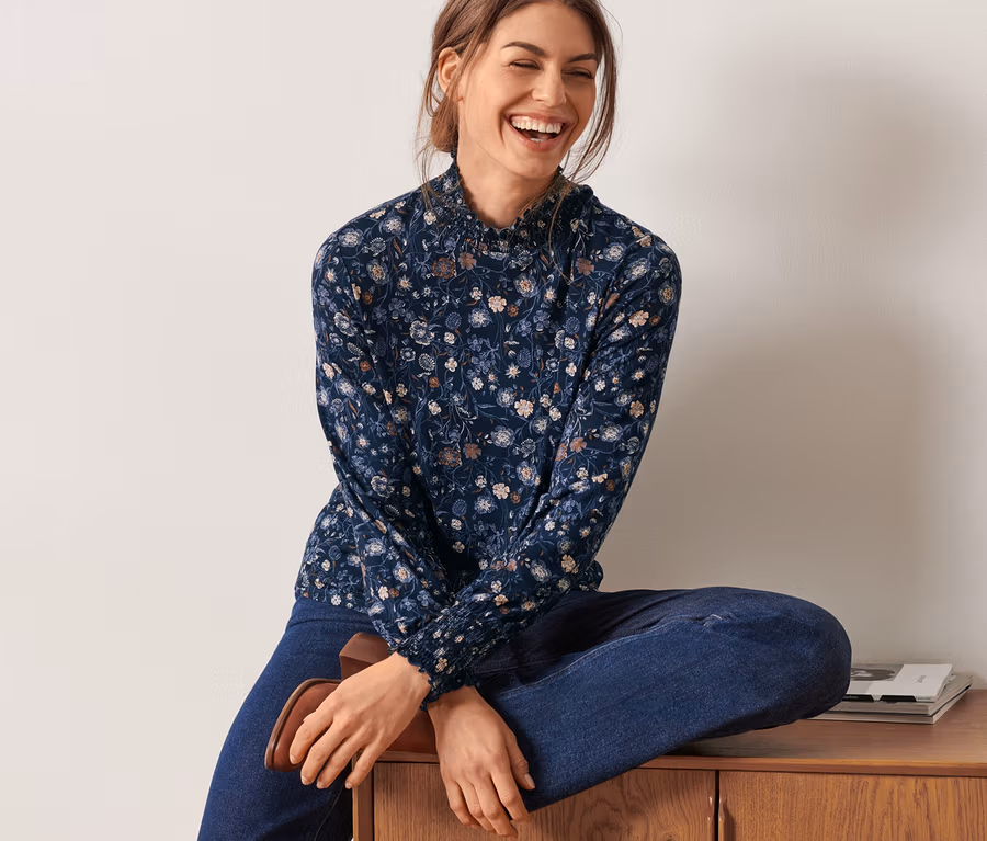 • Blúzka s elastickými žabkovanými koncami rukávov a stojačikom
