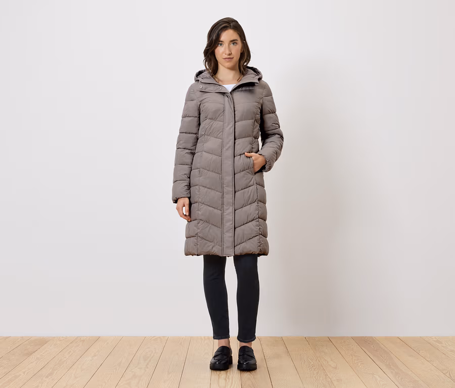 Prešívaný kabát s kapucňou, hnedosivý