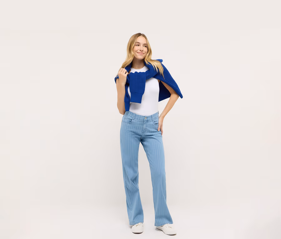 • Moderná silueta so širokými nohavicami a džínsovým elastickým materiálom