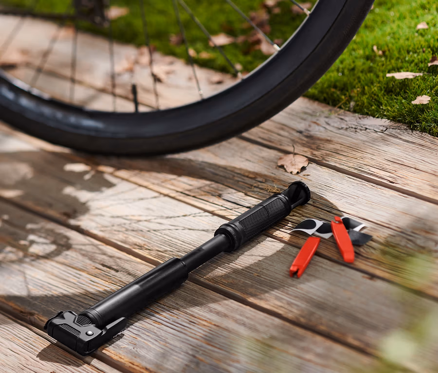• So súpravou na opravu v priehradke na rukoväti: 2 montážne páky na pneumatiky, 3 samolepiace záplaty a brúsny papier na zdrsnenie