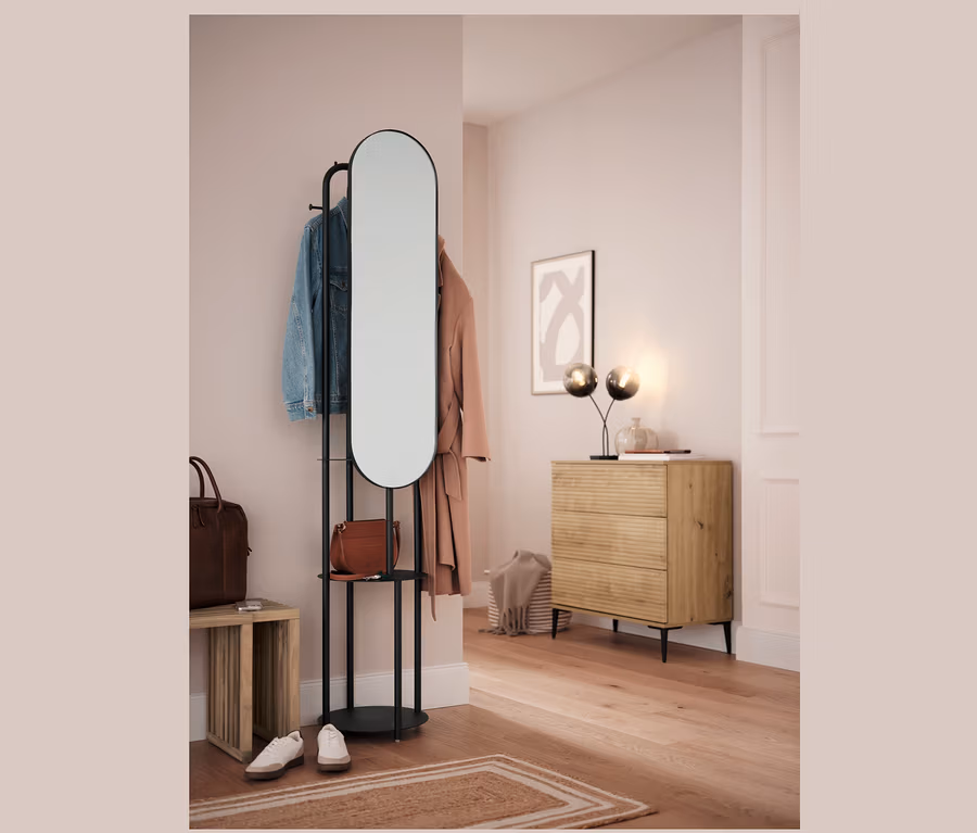 - Zrkadlo v kovovom ráme, šatníková tyč so zarážkami, 2 háčiky, 2 odkladacie plochy za zrkadlom, 1 dno s efektom vznášania