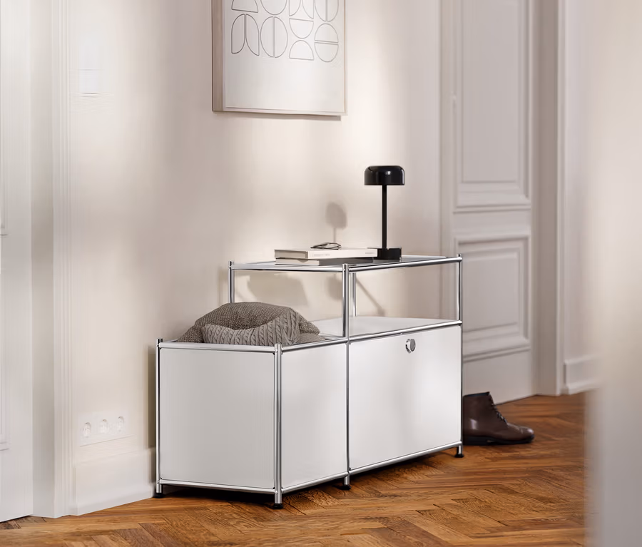 Kovová nízka skrinka »CN3« s výklopným priečinkom a sklenenou doskou, biela