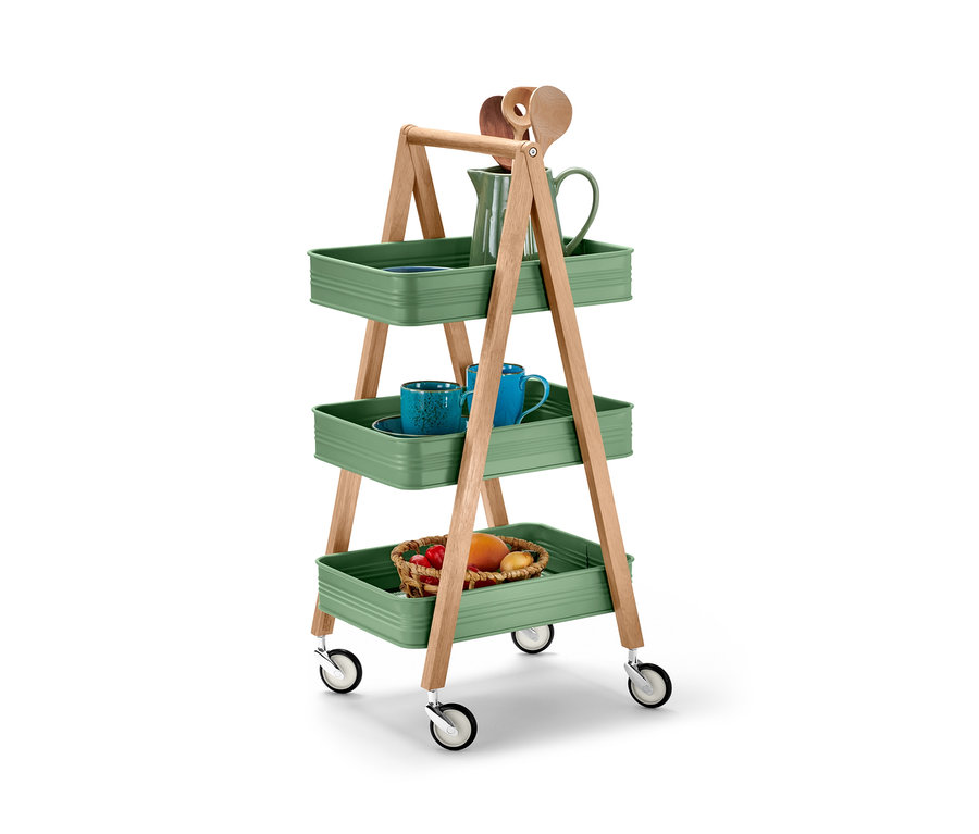 - Vozík na kolieskach s 3 odkladacími plochami, ktoré možno používať ako flexibilný úložný priestor v kuchyni.