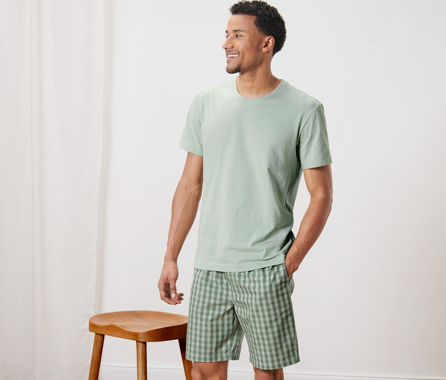 - Nohavice s kockovaným vzorom vichy v kombinácii šalviovej a olivovozelenej