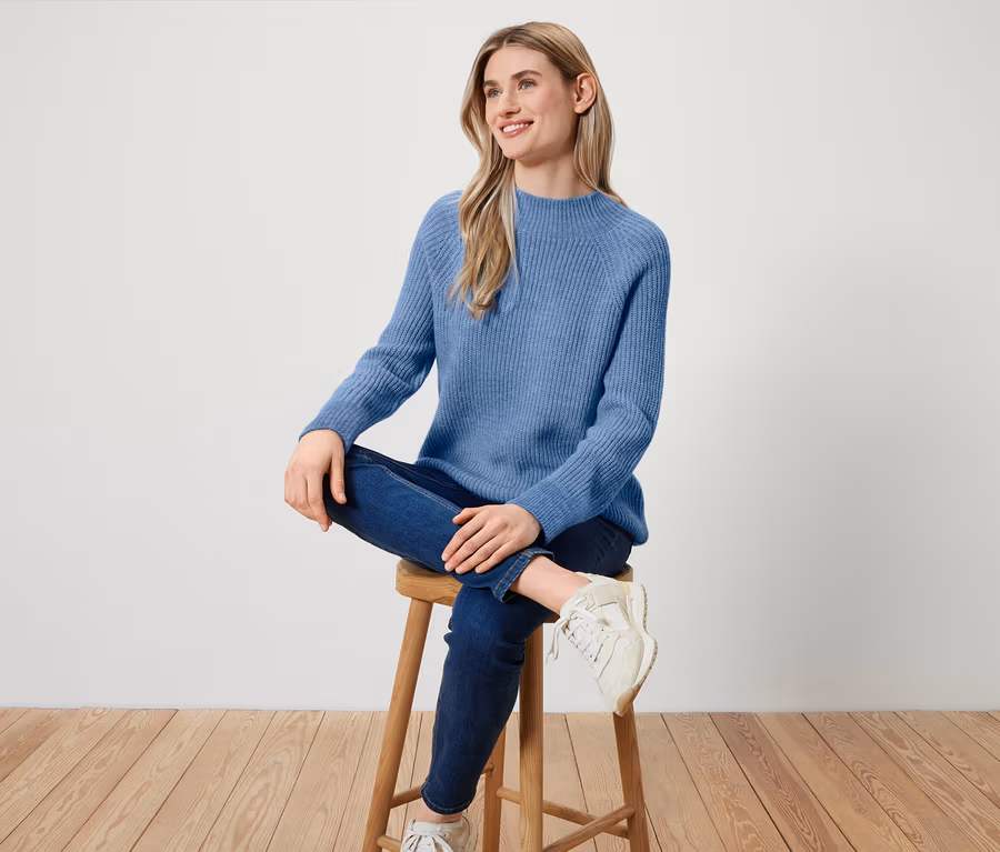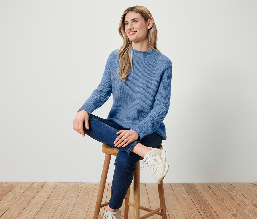 Pulóver z hrubej pleteniny so stojačikom, modrý