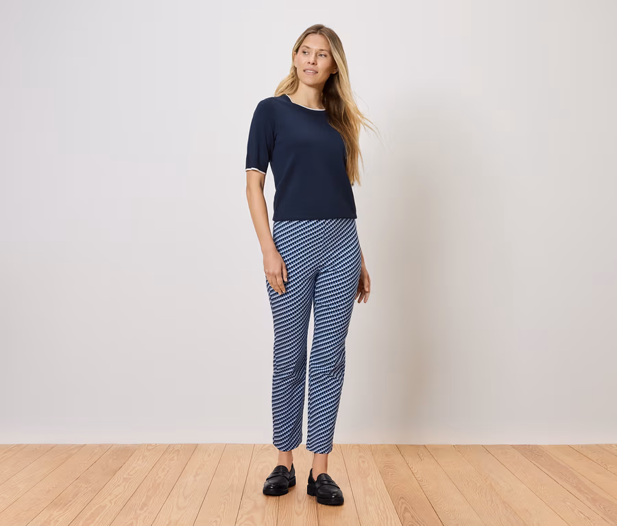 Strečové nohavice, modro-biela celoplošná potlač