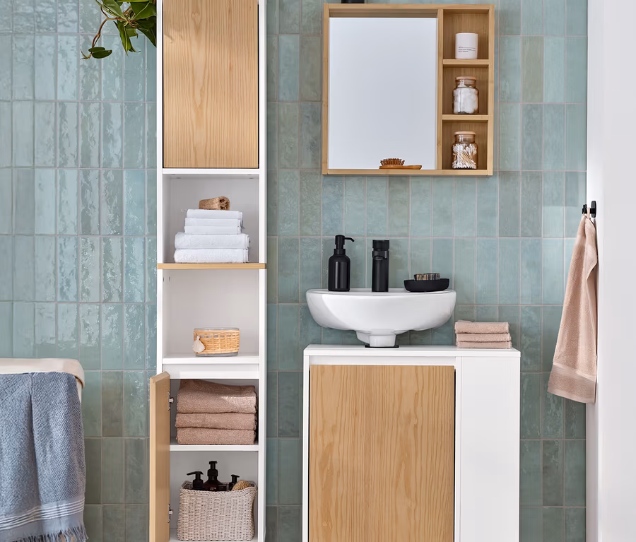 Vysoká skriňa do kúpeľne s otvoreným priečinkom a 2 dvierkami