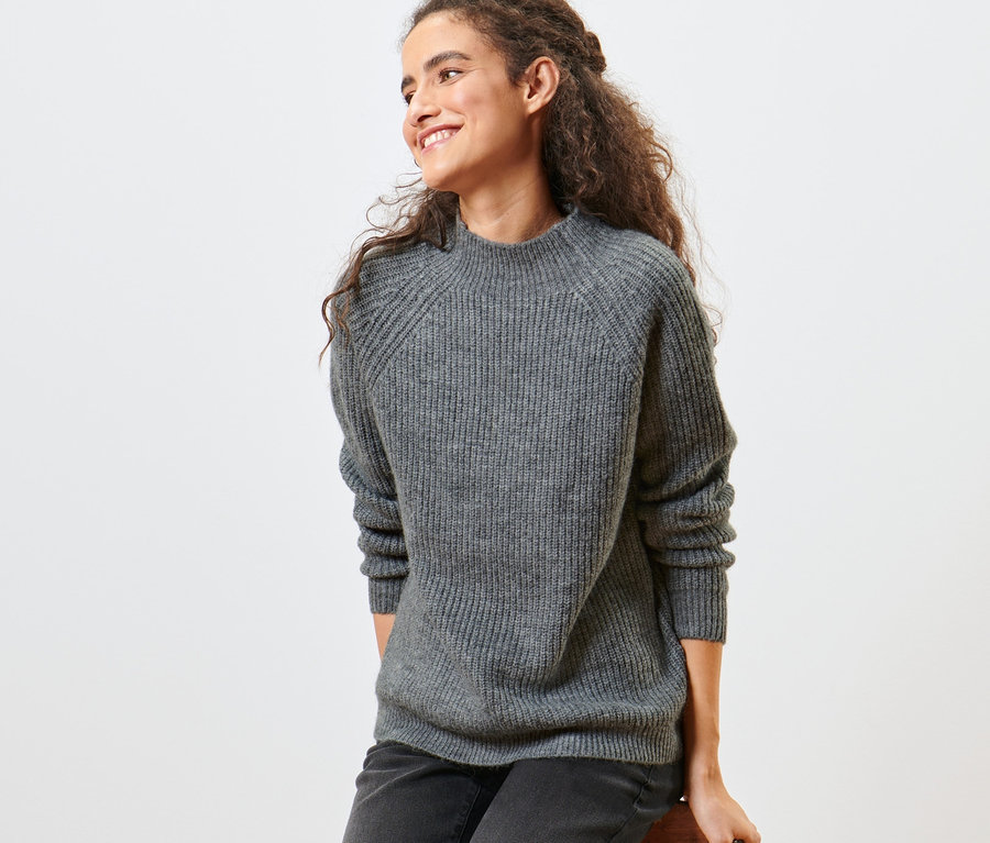 Pletený pulóver so stojačikom, sivý s melírom