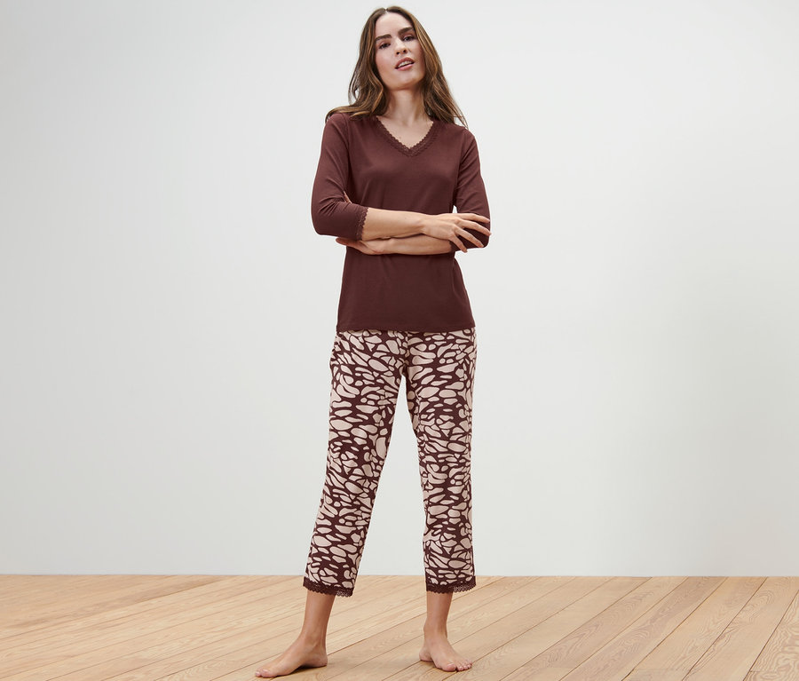 - Dámske pyžamo s jemnou čipkou na výstrihu do V, na koncoch rukávov a nohavíc