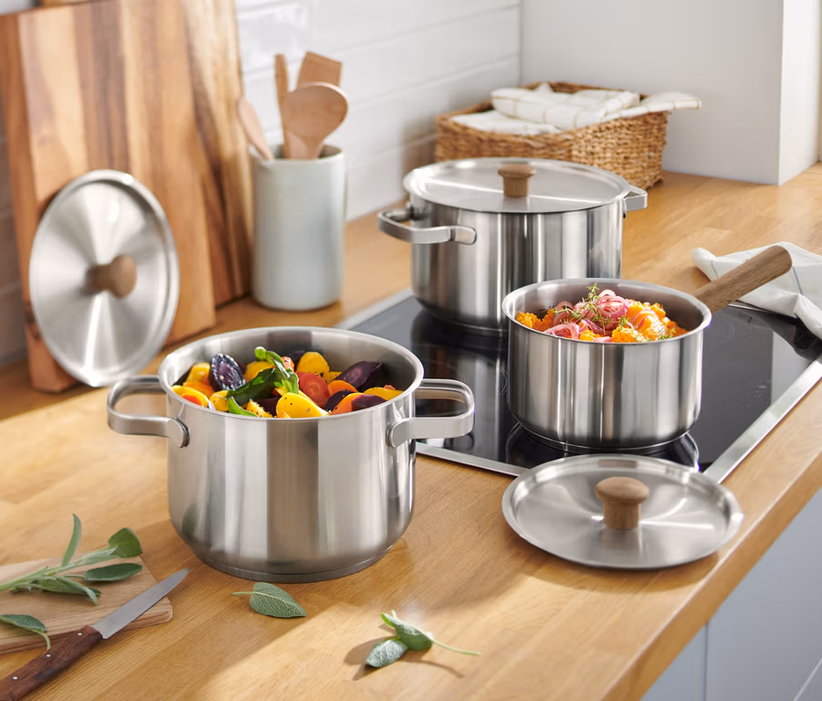 - Súprava obsahuje rajnicu s rúčkou 2,5 l; hrniec 3,9 l a hrniec 6 l