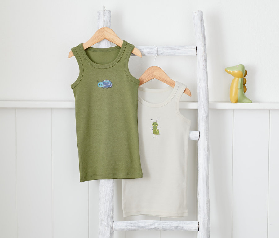 1x biela s potlačou mravčeka na hrudníku, 1x olivovozelená s potlačou chrobáčika na hrudníku