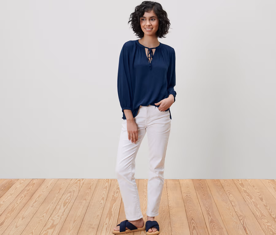 - Tunikový výstrih s jemným nariasením a šnúrkou na zaväzovanie