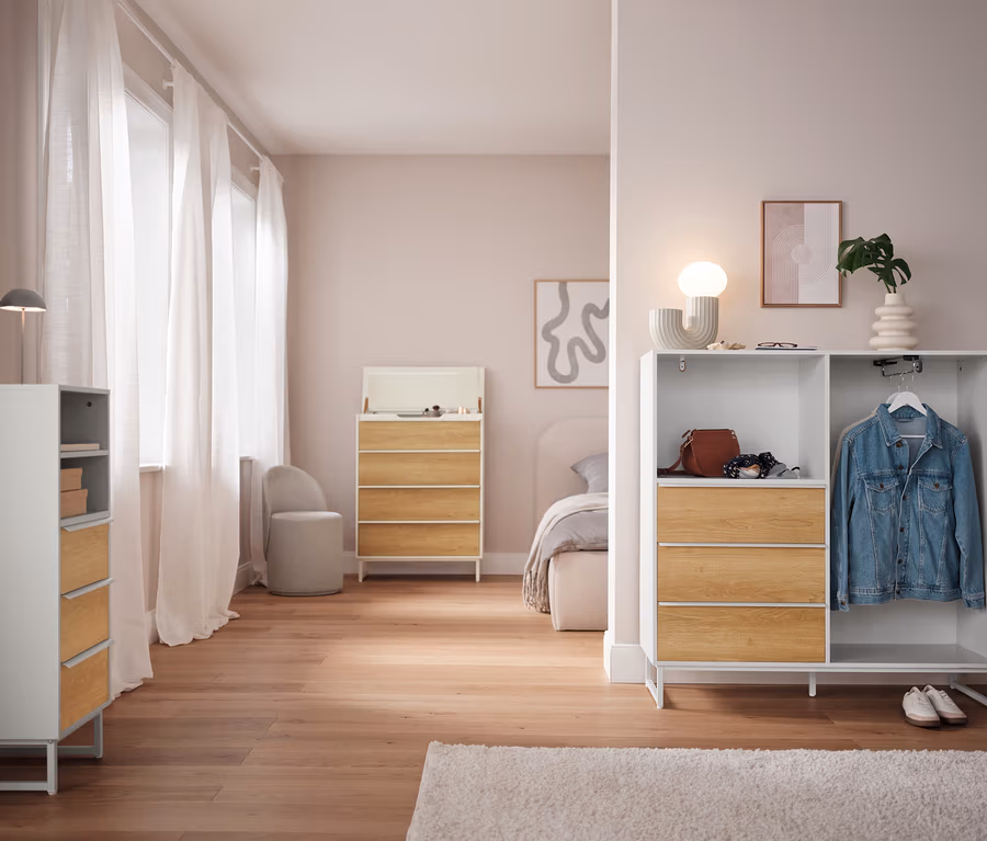 - Odkladacia plocha, 1 otvorená priehradka, 3 zásuvky s kovovou rukoväťou a tlmičom zatvárania, výsuvná tyč na oblečenie