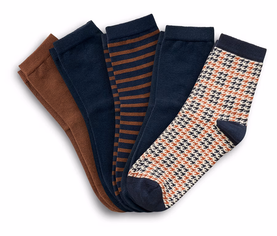 - 2x tmavomodré, 1x viacfarebný vpletený vzor kohútích stôp, 1x pásiky v kombinácii tmavomodrej a koňakovej, 1x koňakové