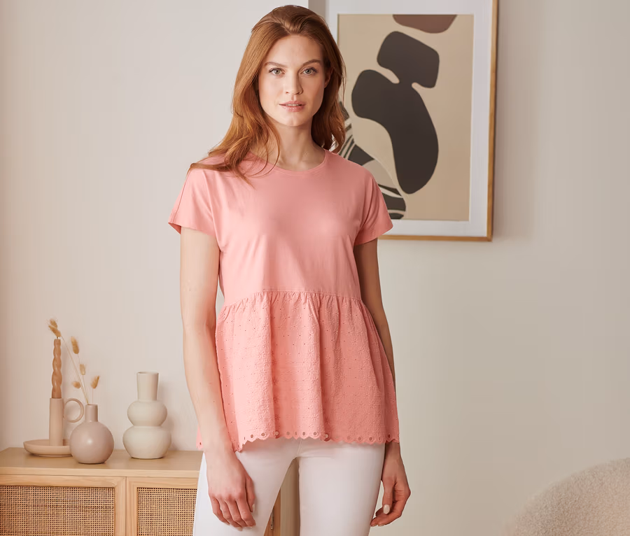 Tričko zo zmesi materiálov s výšivkou, koralové