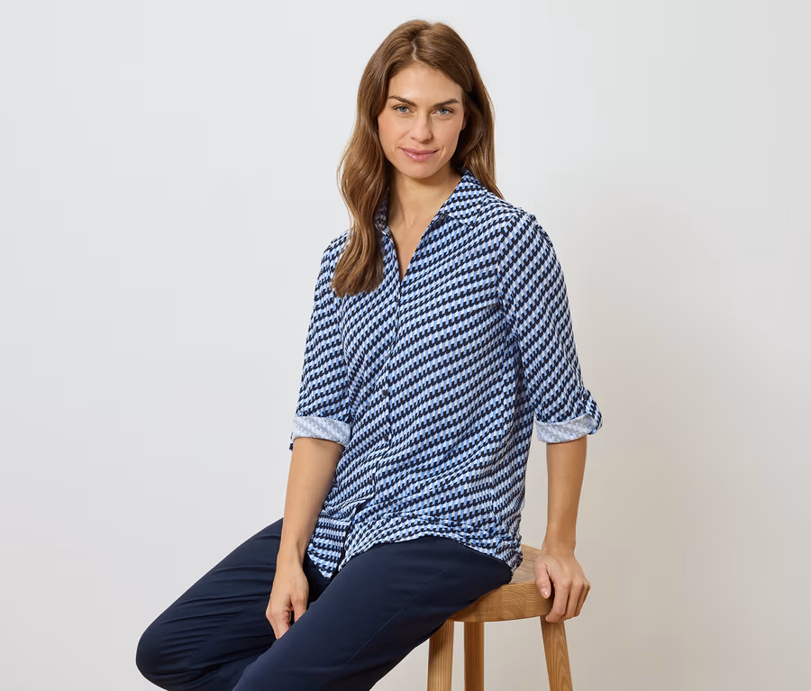 Džersejová piqué blúzka, celoplošná potlač v kombinácii tmavomodrej, bielej a svetlomodrej