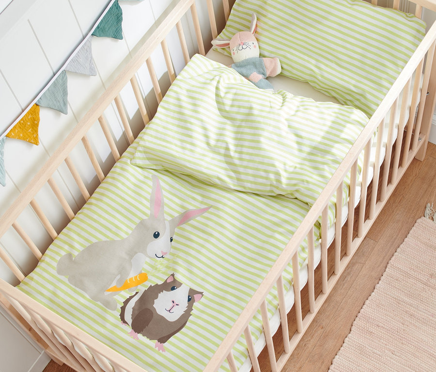 1 strana s prúžkami v kombinácii bielej a žltozelenej so zvieracou potlačou, 1 strana s prúžkami v kombinácii bielej a žltozelenej