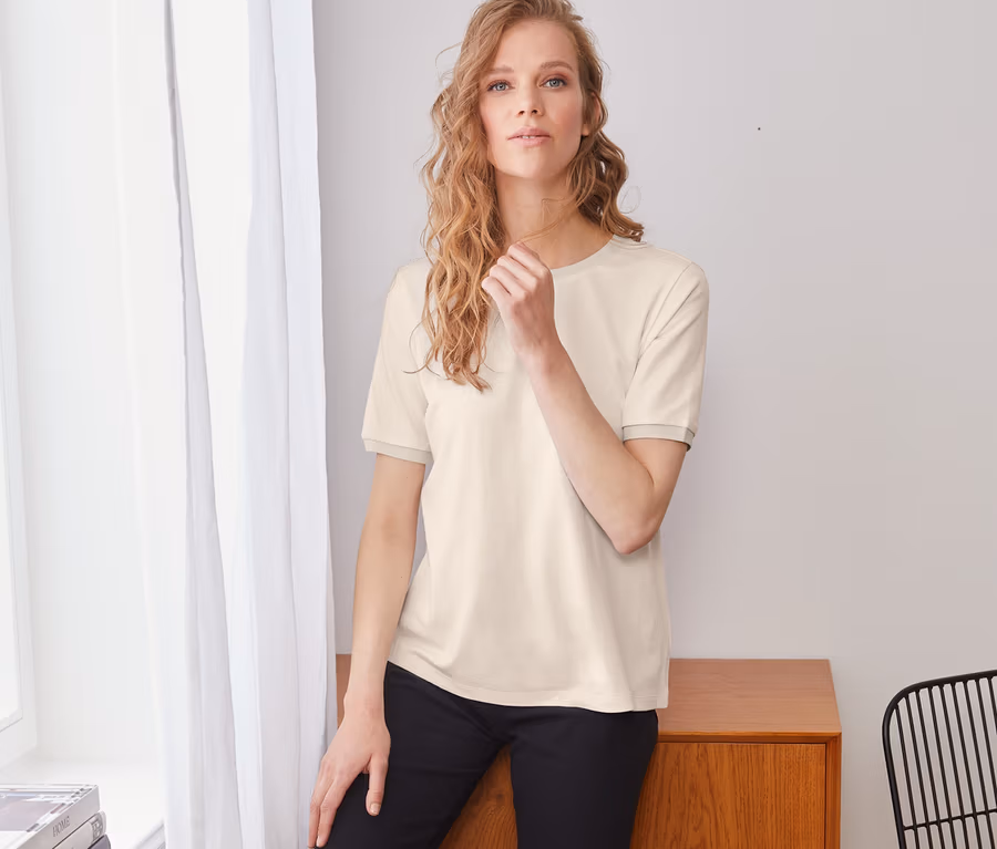 - Dámske tričko s rebrovanými lemami na výstrihu a koncoch rukávov