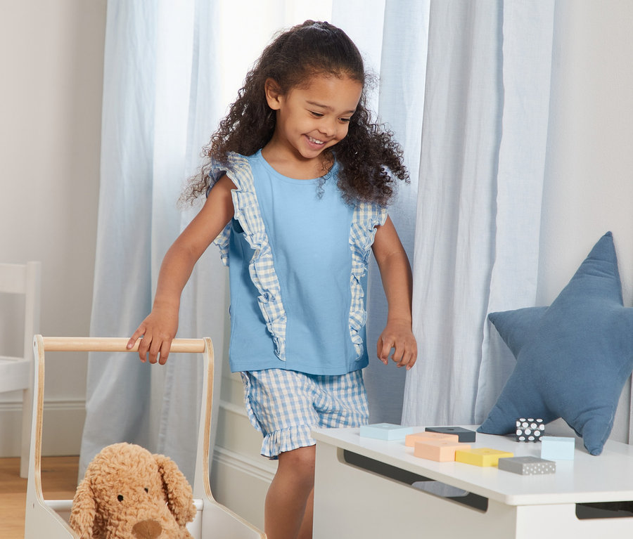 - S nakladanými tkanými volánikmi s kockovaným vzorom vichy na prednej strane