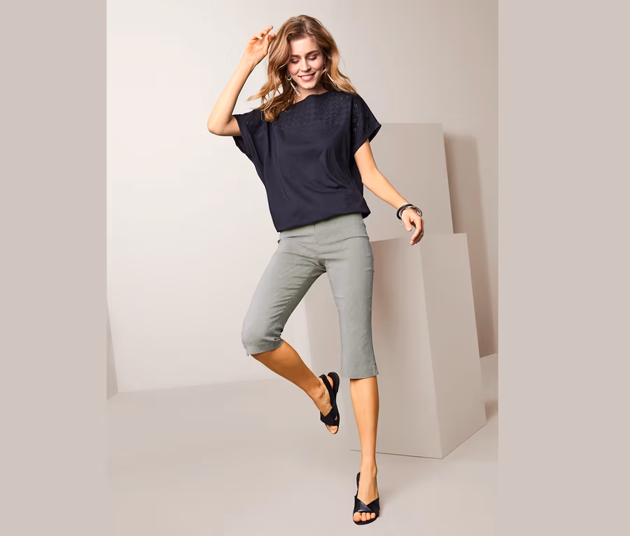 Aj v lete obľubujeme štýlové a zároveň pohodlné modely. Tieto elastické nohavice sú pritom dokonalým základom každého outfitu na voľný čas a vďaka trojštvrťovej dĺžke sa ideálne hodia na letné dni. Dámske nohavice z elastického materiálu s vysokým podielom udržateľnej viskózy sú za každých okolností príjemné na telo, elastan zároveň zaisťuje, že dobre držia tvar a výborne sa nosia pri každom pohybe. Nohavice majú úzky strih a bočné rozparky na spodnom okraji. Pás je elastický, perfektne sedí – a pritom sa nezarezáva.