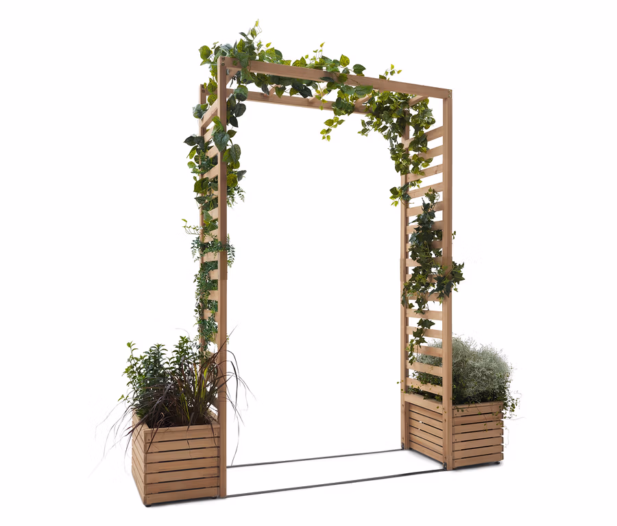 Záhradná pergola s debničkami na sadenie